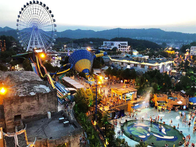 "水世界"占地面积90亩,以地中海地区的地理风貌为原型,以中东地区的文化背景和世界名著《一千零一夜》的故事为主题。建有一千零一夜戏水区、地中海海浪区、土耳其古城区、飓风湾探险区和更衣室、商铺、医疗中心、迷童中心等相关配套服务设施,拥有亚丁风暴、幼发拉梯、辛巴飞毯、波塞冬碗、多哈滑道和爱琴蓝海(海浪区、海啸区)等大型水上游乐设备和游乐区域,游客容量在10000人以上。