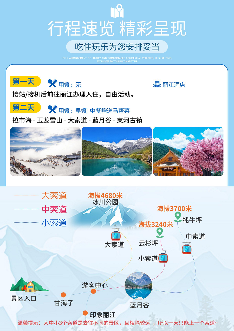 | 门票及地面项目 | 行程中所列景点/场馆首道大门票玉龙雪山→蓝月谷→丽江古城——冰川公园大索道 | 行程中所列景点/场馆首道大门票玉龙雪山→蓝月谷→丽江古城——冰川公园大索道 |
